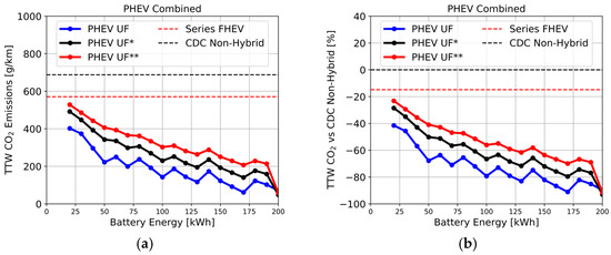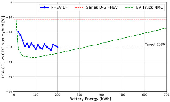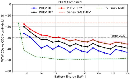 The same calculation is performed for WTW CO2 emissions, and is shown in Figure 14. The most important result is that any PHEV evaluations with batteries larger than 50 kWh can meet the 2030 CO2 standards. This means a WTW CO2 emissions reduction of 30%. In addition, the PHEV series truck reduces emissions on average by 39% for a UF of light-duty, 34% for UF*, and 31% for UF**. To add this idea to other powertrain solutions, the FHEV can save 15% of WTW CO2 with a battery size of 22 kWh, while the EV achieves WTW CO2 savings of approximately 48% with a battery size between 50 and 200 kWh.