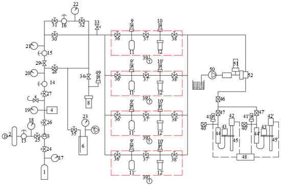 Schematic diagram of experimental device. 1: Gas cylinder. 2: Air compressor. 3: Gas booster pump. 4: High-pressure storage tank. 5: Safety valve. 6: Buffer tank. 7: Vacuum pump. 8: Standard room. 9(9′): Reference cylinder pressure sensor. 10(10′): Coal sample tank pressure sensor. 11(11′): Reference cylinder. 12(12′): Coal sample tank. 13–16: Pressure-reducing valve. 17–23: Precision pressure gauge. 24–38: Valve. 39(39′): Constant temperature system. 40(40′): Vent solenoid valve. 41(41′): Pressure sensor. 42(42′): Servo motor. 43(43′): Liquid storage cup. 44(44′): Gasholder. 45(45′): Drive screw. 46–47(47′): Intake solenoid valve. 48: Control system. 49: High-precision pressure sensor. 50: Automatic back pressure pump. 51: Pressure sensor. 52: Back pressure valve.