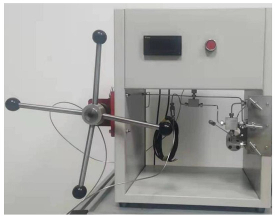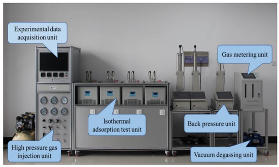 A set of devices that could meet the experimental requirements was built which was able to achieve high-pressure water injection into coal samples, keep the experiment temperature constant, ensure that the pressure will be provided according to the design, and record the gas pressure and desorption data in real time during the entire process. The principle of the device is shown in Figure 2. The experimental device was mainly composed of a vacuum degassing unit, a high-pressure water injection unit, a high-pressure gas injection unit, an isothermal adsorption test unit, a back-pressure unit, an automatic metering unit, and a data acquisition unit. The physical device is shown in Figure 3.