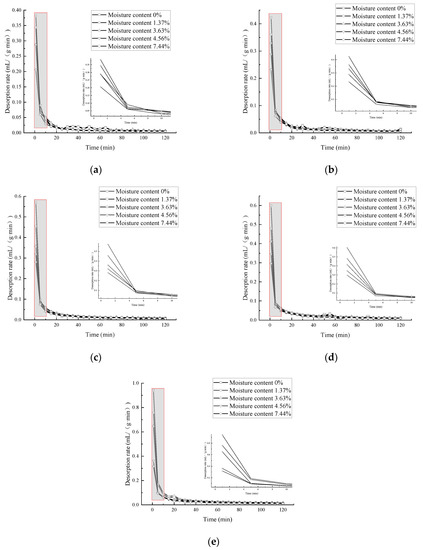 The desorption time was 120 min, and the 5 samples with water contents of 0%, 1.37%, 3.63%, 4.56%, and 7.44%, were, respectively, tested in a stepwise step-down desorption experiment. The desorption curve is shown in Figure 5, and the desorption data of each step-down stage are shown in Table 3.