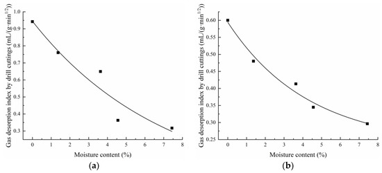 It can be seen from Figure 6 that in each stage of stepwise depressurization desorption, the gas desorption rate was fast in the first 10 min, then the inclination of the drop was obvious, indicating that the gas desorption intensity was high in the early desorption stage. After 30 min, the rates at different pressure drop stages were basically the same, gradually tending to be 0 mL/(g·min). In the first 10 min of desorption, moisture reduced the rate significantly, which decreased with the increase in moisture and was generally the same as the desorption rate after 30 min. We learned that moisture mainly affects the gas desorption in the initial stage (the first 10 min), and in the middle and later stages (after 30 min), the effects nearly fade away. Therefore, high-pressure water injection can be used to enhance the coal moisture in mining areas, and the inhibitory effect of water on desorption in the early stages should be utilized fully, thus reducing the difficulty of gas disaster prevention and control. Meanwhile, there exists a reasonable value of the moisture content that affects the gas desorption rate, so the water injection method should be used according to the specific properties of the coal seam.