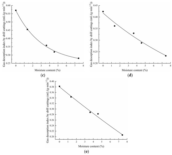 It can be seen from Figure 7 that when the added water increased from 0% to 7.44%, the K1 of the 0.5 MPa–0 MPa depressurization stage descended from 0.942 mL/(g·min1/2) to 0.317 mL/(g·min1/2), with a decrease of 66.3%, and the K1 values of the other pressure drop stages decreased by 50.6%, 50.8%, 45.2%, and 46.1%, respectively. In each depressurization stage of the desorption process, the gas desorption index decreased with the increase in moisture, and the index of the dry sample was the largest. When the three desorption stage, 1.5 MPa–1 MPa, 1 MPa–0.5 MPa, and 0.5 MPa–0 MPa, were followed, the gas desorption index value decreased with the increase in the water content with a negative exponential trend, indicating that in the early stage of water injection, the gas desorption index declines greatly and the descending step of the index gradually narrows down with the increasing external water, finally tending to be stable. In the desorption stages of 2.5 MPa–2 MPa and 2 MPa–1.5 MPa, the gas desorption index decreased linearly with the increase in moisture. This study shows that added water can reduce the K1 index, thereby effectively bringing the risk of a coal seam outburst down. There is a reasonably matching value between the water content and the index. In fact, the water injection parameters are not fixed and unchanging, which means that coal seams with diverse metamorphic degrees in different areas correspond to various ones, so water injection parameters should be determined by the attributes of the target coal seam.