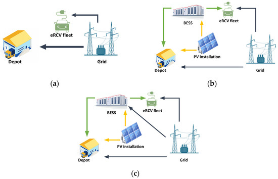 The electrification of a vehicle fleet, ideally powered by renewable energies [2], is seen as one potential solution. In particular, urban logistics, local authority fleets (i.e., waste management) or public transport fleets (i.e., bus fleets) can benefit the most from electrification within the road transport sector due to their well-structured and planned daily routes [3,4,5]. Although there is no official number, there are some councils that have already replaced part of their fleet or are in trials to switch from conventional diesel power to electric. To name a few, in the UK there are some electric refuse collection vehicles (eRCVs) operating in London, Manchester, Brighton, York, Bournemouth, and Glasgow.