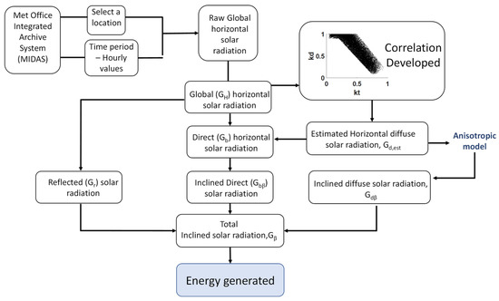 The PV energy generation for scenario 2 and scenario 3 was modelled using MATLAB, following the steps shown in Figure 2. The hourly solar irradiation data for this study was obtained through the Centre for Environmental Data Analysis (CEDA) archive. The CEDA archive is the UK national data centre for atmospheric and earth observation research that ensures easy access to horizontal solar irradiation data from the open data version of the Met Office Integrated Data Archive System (MIDAS) [41,42]. The hourly data was measured at a weather station located in Walnatt (Nottinghamshire, UK) between 2009 and 2019 in kJ/m2. The values of global solar irradiation were then averaged and transformed into kWh/m2 to be used as input to the solar model. The datasets correspond to hourly measurements of horizontal global solar irradiation (). Empirical correlations were used to estimate values of horizontal diffuse solar radiation () [43].