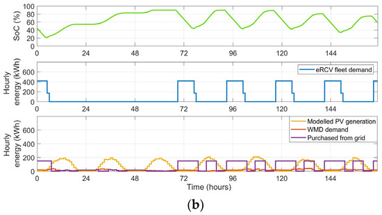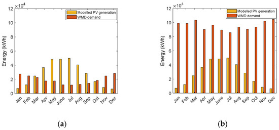 Monthly modelled PV solar energy generation and energy consumption at the WMD: (a) with a conventional RCV fleet; (b) with an eRCV fleet.