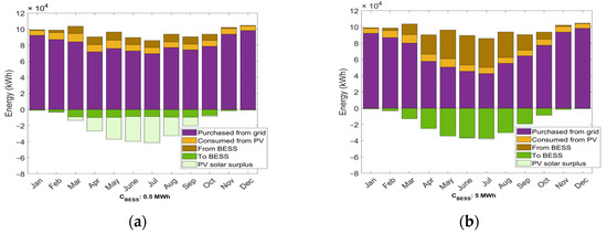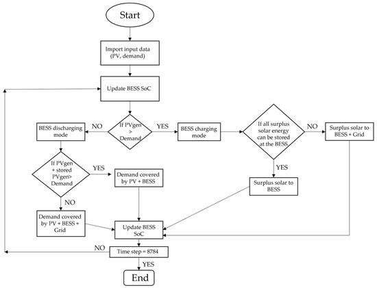 As it can be seen from Figure 4, the BESS is charged exclusively from the PV installation. The algorithm is run 8784 times as this corresponds to the total number of hour time steps per year. The BESS is modelled assuming that any voltage or current change is achievable with changes in [27]. The is the most frequent parameter used to evaluate the energy status of the battery [53]. According to Byrne et al. [54], this type of model is the best choice when the aim is to perform a technoeconomic analysis and operate in the range of minutes to hours. Yang et al. [27] and Rosewater et al. [53] defined the charging/discharging process of the battery as in Equation (19):