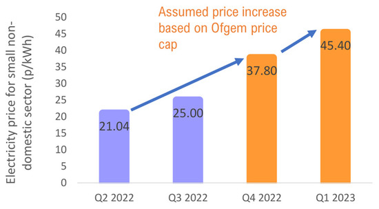 Predictions point to a continuous price increase over winter. Unfortunately, the available data for the non-domestic sector has not been updated since Q3 2022, just before the Ofgem price cap came into effect in the UK (1 October–31 December 2022). Since then, the Ofgem price cap has been updated twice. Thus, the change for electricity prices in non-domestic consumers has been extrapolated from the percentage change corresponding to each Ofgem price cap. From the most recent published report for domestic energy prices, the price cap increased by 80% from April 2022 to October 2022 [56] and 20% from October 2022 to January 2023 [57].