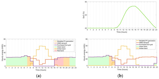 Scenario 3 (Figure 1c) has PV panels and a BESS installed at the WMD as in scenario 2; however, the BESS in this scenario is not only charged from the PV solar installation but also from the grid. As in scenario 2, an algorithm has been developed to manage to energy flow. The objective of the algorithm is to avoid any grid power connection upgrade despite the increase in energy demand after introducing the eRCV fleet into the WMD at the expense of using the grid-supplied energy at peak prices. Therefore, the power capacity connection remains at 0.15 MW. Details about the algorithm created for scenario 3 are explained in Section 2.5.2.