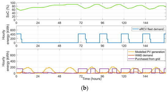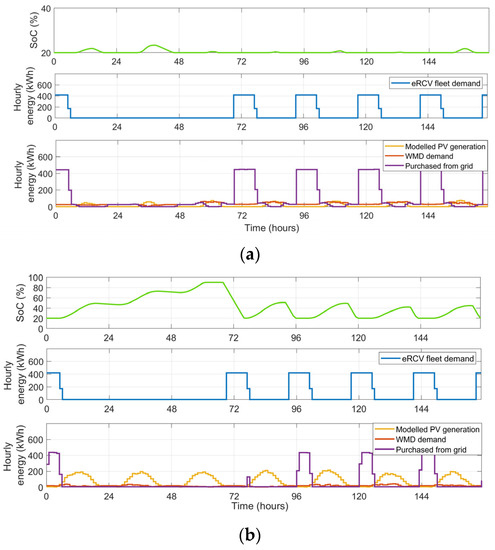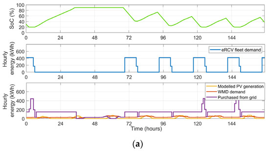 On the other hand, the battery is discharged when there is not enough PV solar energy to meet the energy demand of both the WMD and the eRCV fleet charging. When the BESS is discharged to the minimum , the BESS cannot be further discharged. If the energy demand has not been covered, the grid is then required to support the energy demand from the WMD and the eRCV fleet.