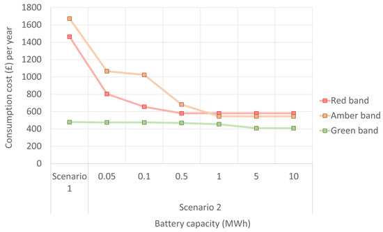 However, if the upgrade of the power connection capacity is not an option for the logistics or commercial company (i.e., 0.15 MW) due to network constraints out of their control, it would still be worth further exploring the potential benefits of introducing PV panels and a larger BESS. This allows the system to meet the increased energy demand without surpassing the grid connection power capacity. If compared with scenario 1 for the same power connection capacity, the benefits of introducing a 10 MWh BESS when the power connection is not upgraded can be seen in the reduction of the excess capacity charge incurred by the site from approximately GBP 0.8 M to zero (Figure 16b). However, economically it would be difficult due to the high cost of the large BESS shown in Figure 16a (scenario 3). Although the cost of energy storage technology has been decreasing over the last decade [65,66] and from [61], cost projections show a further reduction of between 28% and 58% in capital cost by 2030, BESS cost is still a major barrier to these systems.