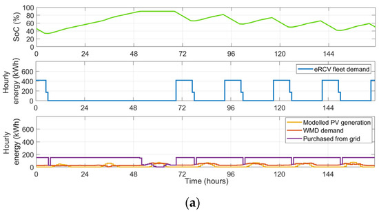 The modelled PV solar energy generation at the WMD can be seen in Figure 3 (yellow column) as a comparison with the WMD energy consumption (orange column) when the WMD has a fleet of conventional diesel RCVs (Figure 3a), and when the fleet is switched to eRCVs (Figure 3b). As it was previously mentioned, replacing a diesel-powered fleet of RCVs with an electric fleet has a significant impact on the energy demand required at the site.
