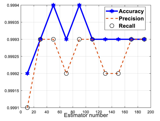 Figure 1 displays the variation of the accuracy, precision, and recall parameters of our QSVM model to show its ability to detect DDoS attacks. Curves vary between 99.91% and 99.94%. This result can be explained by the fact that our QSVM performs easily the classification procedure with a very low error rate.