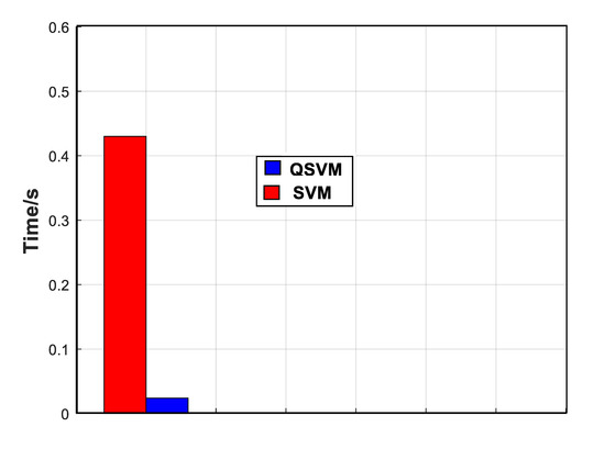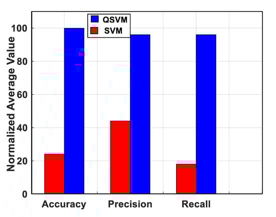 Figure 2 compares the normalized average value of accuracy, precision, and recall parameter variation of our QSVM (represented by blue color) and the classical SVM (highlighted by red color). From Figure 2, it is clear that QSVM maximizes the success rate (close to 100%) to detect and classify data and outperforms the classical SVM model in terms of the three metrics considered in this work (accuracy, precision, and recall). To prove the performance of our proposed scheme QSVM, we study its behavior in terms of the execution time (calculation time). For this issue, Figure 3 compares our QSVM (represented by blue color) and SVM (highlighted by red color). It is clear that our QSVM outperforms SVM with a saving rate of 93%. This result proves the effectiveness of our proposed QSVM.