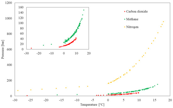 Phase boundary equilibrium diagrams for pure carbon dioxide (red), methane (green), and nitrogen (orange) hydrates [118,119,120,121,122,123,124,125,126,127].