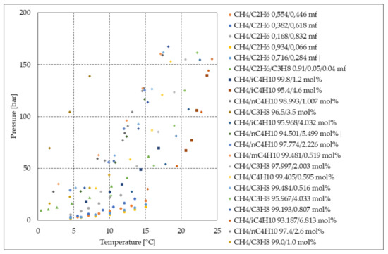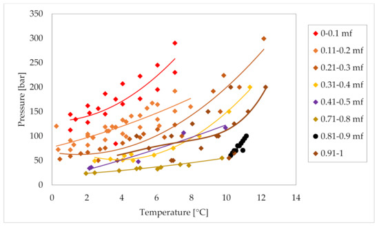 These diagrams cannot be used to define the phase boundary equilibrium conditions for the mixture, being the process depending on the properties of the reactor and, mainly, the shape, typology, and porosity of sand. However, these experimental values clearly prove the benefit due to the introduction of 0.05 mf propane in the system.