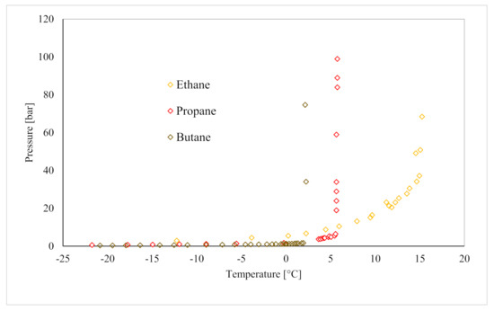 Molecules such as ethane, propane, and butane are capable of forming hydrates at pressures up to one order of magnitude lower than those required for methane and carbon dioxide at the same temperatures. This is clearly visible in Figure 3, where the phase boundary equilibrium conditions of C2H6, C3H8, and C4H10 hydrates are shown.