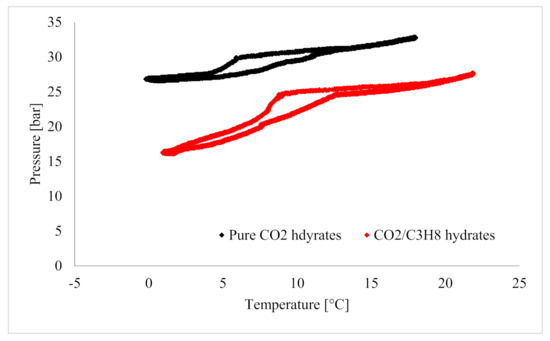 Figure 4 deals with the enclathration of an energy carrier such as methane. Similar positive results can be also obtained for the capture of waste gases, such as carbon dioxide. The diagram in Figure 5 describes the formation of CO2 hydrates in a small-scale reactor (whose detailed description can be found in [146,147]) filled with pure silica sand, in order to simulate a natural marine deposit. With this configuration, Figure 5 describes the formation of pure carbon dioxide hydrates and the same process carried out with a binary CO2/C3H8 mixture, with a concentration equal to (0.95/0.05 mf).