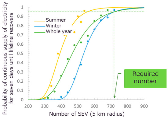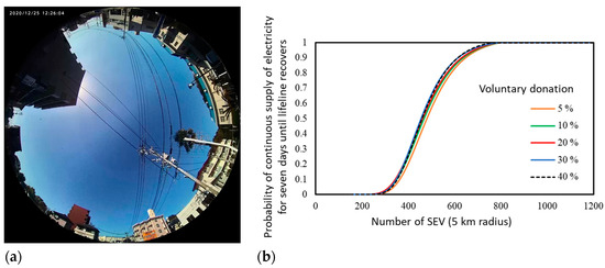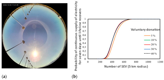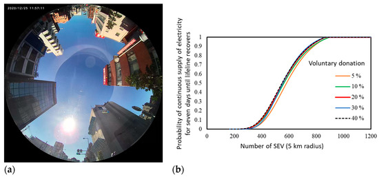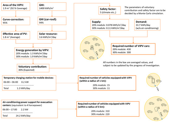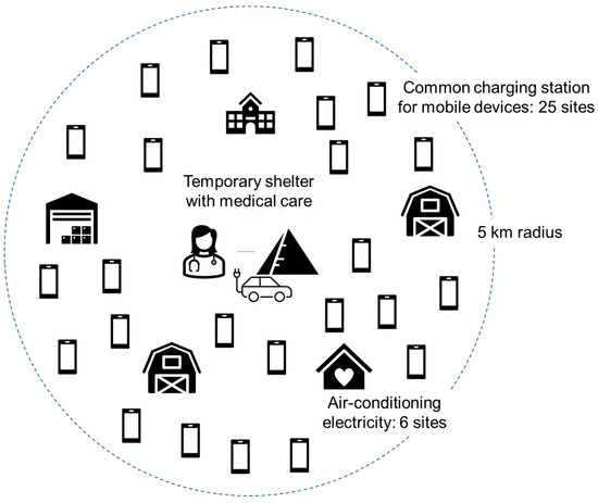 - A significant earthquake occurs in a scenario city (“PV City”) (radius 5 km). In the first few hours, the PV City local government transitions schools, community centers, and care centers to evacuation centers equipped with spot coolers at six locations (4 hp each). In addition, the PV City local government calls for temporary first-aid stations and multiple charging stations for mobile devices for local people to help access disaster information over and above access to conventional disaster infrastructure. The number of temporary charging stations accessible within a 1 km walk is 25. Because such facilities require electricity, the PV City local government calls for a voluntary donation of electricity from PV-equipped vehicles; a certain percentage of drivers check the charging status (SoC) of their vehicles (every hour), and if SoC is over 90%, they decide to go to one of the use points and provide electricity until the charge of the battery falls to 50% (vehicle batteries are recharged by PV on vehicles). Other efforts are in place to help keep disaster prevention equipment and facilities functioning. Seven days later, the PV City local government is notified that regional lifelines have been restored.