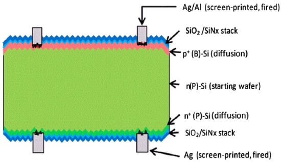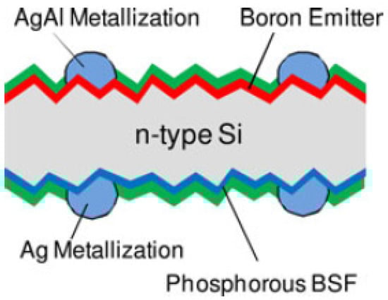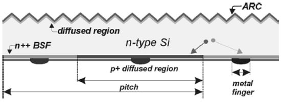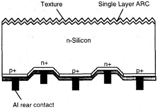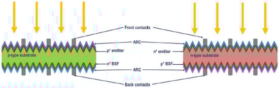 Bifacial Solar Cells (BSC) concurrently gather photons from the incident solar intensity and albedo radiation, receiving both the front side and back side of a device, whereas monofacial solar cells are able to collect only those photons from the incident solar intensity on the front side of the solar module. Since the 1960s, these BSC have been researched [2] and were first characterized in the scientific literature by Luque et al. [3] as a novel thought for increasing the energy yield output of PV systems. An enhancement of 50% in electric power production can be achieved at once by collecting both the direct and albedo radiation from the rooftop and the environment around a module with the help of a focused device, as presented by Cuevas et al. [4]. Accordingly, it was demonstrated that even BSC amplifies the power density of PV modules compared with monofacial cells and, at the same time, reduces the cost of the PV system [5]. An additional benefit of BSC is the reduction in the working temperature of the cell and the equivalent augmentation in the highest power production, which is due to the condensed infrared absorption in aluminum back metallization absence, even though there is an add-on in thermal insulation on the rear side of the bifacial module rather than the conventional rear sheet cover [6,7,8]. The cross-sectional view of the majority of frequently fashioned bifacial crystalline silicon (Si) solar cells is shown in Figure 1. In a sequence to collect illumination from either side or both concurrently, an open metallization grid is written. For the cells of n-type, the p+ diffused layer will act as the emitter, while the n+ layer serves as a Back-Surface Field (BSF), and vice versa, for the p-type solar cells. In order to realize the open metallization grid at trade-making scales, passivizing anti-reflective coatings (ARC) and texturized wafers are moderately covered by screen-printed metallic contacts [9].