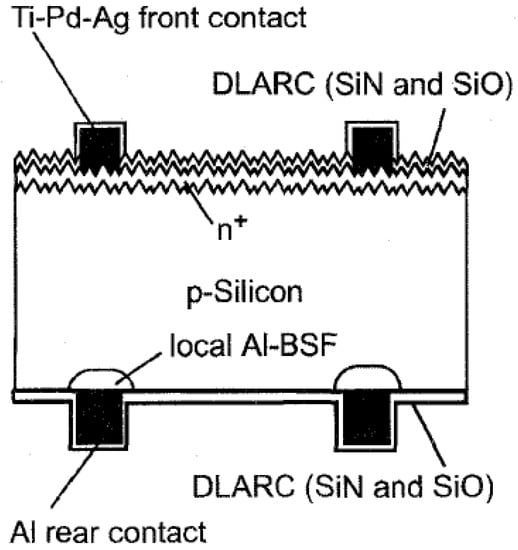 Andreas Hubner et al. [11] also fabricated a new cost-effective PV energy bifacial cell by combining Plasma-Enhanced Chemical Vapor Deposition (PECVD) Si nitride film, which has excellent surface passivation properties with simple alloyed Aluminum (Al) BSF. The importance of Al BSF was proved by experimenting on the BSC with and without a local Al BSF, which, in turn, produced power with an efficiency of 18.2 and 17.8% in the front and rear, respectively, whereas without Al BSF, efficiency was 17.7 and 15.9% in the front and rear, respectively. The work also checked the impact of Double-Layer Anti-Reflective Coating (DLARC) with Single-Layer Anti-Reflective Coating (SLARC) and the cell design, as shown in Figure 3. It produced power with an efficiency of 4.6% AM 1.5G weighted reflectance in SLARC, and in using DLARC, the weighted reflectance was only 3.3%. Hence, by coating DLARC, 28.3% of photon absorption is improved by varying the refractive index of PECVD Si Nitride. However, the experiments concluded that DLARC is an additional advantage along with local Al BSF, which increases the rear efficiency by 2%.
