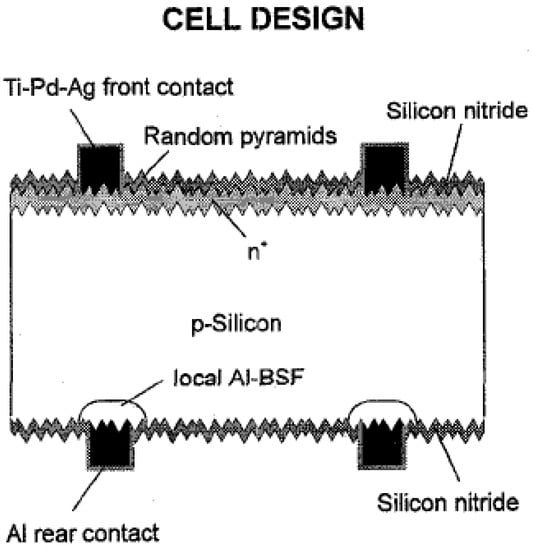 Light degradation of solar cell performance was investigated by H. Ohtsuka et al. [16], and they fabricated a bifacial type of rear-floating emitter solar cell and triode solar cell using four types of wafers, as a wafer resists light degradation. Boron-doped Czochralski (CZ), Magnetic field applied CZ (MCZ), Gallium-doped CZ (CZ (ga)), and FZ wafers were compared and analyzed by the research team. Two different types of solar cells were fabricated by modifying the rear emitters and texture structures. The bifacial type has a rear-floating emitter solar cell with random texture, and the triode cells have an inverted pyramid texture and front contact emitters whose cross section is given in Figure 8. Both cells were analyzed for their initial front and rear characteristics with four types of wafers. Based on their substrate data, in the rear-floating emitter, a maximum of 20.8% efficiency was achieved in front using 5 MCZ wafers, and in the rear, a maximum efficiency of 16.2% was achieved using 8 CZ wafers. In the triode cell, maximum front efficiency of 20.4% and rear efficiency of 18.9% were obtained using a 6 FZ wafer. Based on the investigation report, the research team suggested using triode cells for higher efficiency, and they also reported that, except for the Boron CZ wafer, the other three wafers showed no light degradation.
