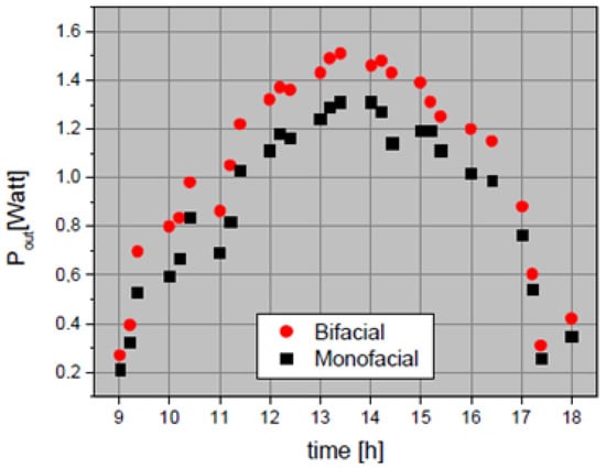 Kranzl et al. [15] suggested using Boron (BSF) alloying over the commonly used Al BSF alloying as it gets diffused into the water, causes no measurable bowing, and achieves higher carrier concentration. The proposed model was mounted facing south with an inclination angle of 300 and 50 cm above the ground, and the power output analysis with respect to time was examined. The generated analysis graph (Figure 7) showed a 19.5% gain in power output in bifacial compared to monofacial solar cells. Research experiments proved that SG Si wafers had 16.1% maximum efficiency in front-side illumination and 12.4% in back-side illumination.
