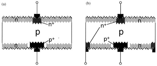 Ohtsuka et al. [14] developed semiconductor P-N junctions having a triode structure with emitters on both sides. Figure 6 shows a schematic diagram of the BSF developed by the authors. The front side has a conventional emitter and local diffused emitters on both sides, and the rear side is the p+ region of the local diffused one. The fabricated solar cells obtained 3-inch and 250 μm thick FZ-Si wafers through a photolithography process. This process consists of thirteen steps of photo masking, which includes diffusion of phosphorus and fabrication of the rear side finger electrodes. On each wafer, 1 cm square cells were arranged. P-type 0.2, 0.5, and 1.0 Ω cm substrates were chosen because of their low series resistance properties. Even when the diffusion length of the charge carriers is much shorter than the cell thickness, the rear side emitters are able to collect the minority carriers that are generated at the bottom, which leads to higher short-circuit current density than the usual solar cell. This cell is not affected by light degradation due to the presence of low-resistance CZ substrates compared to conventional cells. Low resistive loss is absorbed when light is introduced from both surfaces. The output power increases when this type of cell is used with a static concentrator. Inverted pyramid-shaped cells and an anti-reflection coating of 110 nm thick single-layer thermal oxide decrease the surface reflectance, and it is fabricated using photolithography and etching in potassium hydroxide on both surfaces. There are heavy as well as light diffusions on the emitter of the cells. The sheet resistance of the line-shaped heavily diffused emitters is 20 Ω/sq, whereas the lightly diffused emitters have 250 Ω/sq.