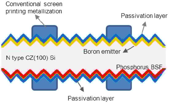 With a slight modification to the work of Boscke et al. [18], Hung Ching Chang et al. [21] also used 180 μm initial thickness 6-inch n-type CZ Si wafers in a BSC. Post-texturing wafers were then doped with boron and phosphorous on the front and BSF, respectively, and their cross-section is given in Figure 13. In this study, different Ag/Al pastes (TX1, TX2, and TX3) were applied, and their electrical performance was comparatively analyzed. Based on the study, TX3 showed a 3% cell efficiency gain due to enhanced V(OC), Isc, and FF because of the smoother texturing surface compared to TX1 and TX2. In industrial processes, the team achieved a maximum efficiency of 20.63% in N-type BSC.