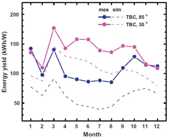 The electrical energy yield of the TBC a-Si:H semi-transparent PV modules mounted with different h. The ‘‘mea” and ‘‘sim” denote the measured and simulated values, respectively. In x-axis, ‘‘1” is corresponding to January, while ‘‘12” to December. The solid lines are eye guides [24].