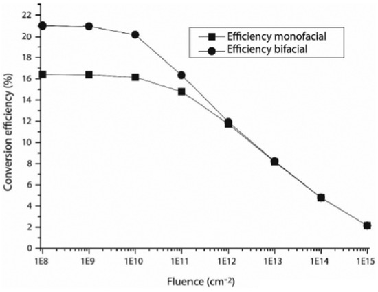 Gökhan Sahin et al. [25] theoretically investigated the characteristics of BSC with respect to particle irradiation, as explained in Figure 15. Based on his theoretical analysis, the conversion efficiency of bifacial cells depends on their particle fluence and bifacial coefficient. He also stated that at a point of 1E12 cm−2 fluence, bifacial and monofacial conversion efficiency, as inferred from the graph (Figure 16), is almost similar, and from that point, it gradually becomes equal.