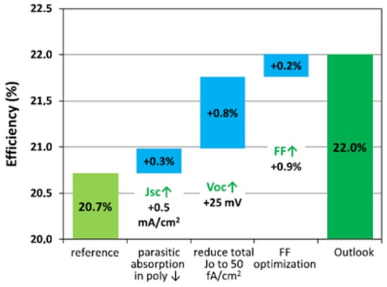 Stodolny et al. [26] fabricated a bifacial n-type solar cell with low-pressure chemical vapor deposition of n+ polySi passivation on the back side, as shown in Figure 17. In his work, he experimented with different doping and passivating techniques of polySi and made a comparative study of them. Thermal-oxidized n-poly passivation of 39 Ω/sq showed the highest efficiency of 20.09% compared to thermal oxidation of polySi of 46 Ω/sq, which showed 19.75%. Likewise, 71 Ω/sq nitric acid oxidation of Si produced an efficiency of 20.72%, whereas 158 Ω/sq produced only 19.77%. Furthermore, the efficiency of the module can be increased to 22% (Figure 18) by reducing the parasitic absorption in polySi, reducing the total dark saturation current J0 to 50 FA/cm2 and optimizing the FF.