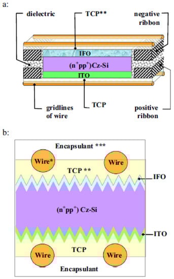 Schematic of a bifacial TCP-containing LGCell: sections (a) along and (b) across the wires. The cell in picture (a) is not encapsulated [29]. * round soldered copper wires 60 μm. ** transparent conductive polymer, 20 μm thick. *** polypropylene lamination film, 40-μm-thick.