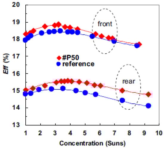Efficiency as a function of concentration ratio for LGCell #P50 and reference LGCell under front and rear illumination [29].