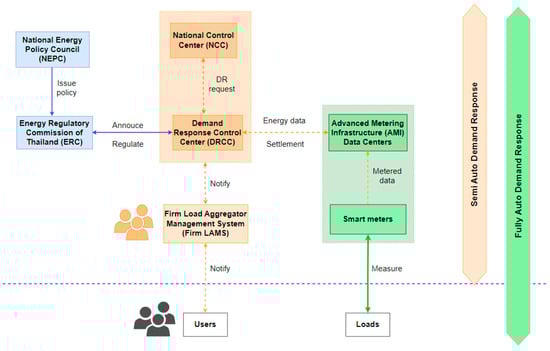 Since 2015, the Energy Policy and Planning Office (EPPO) Ministry of Energy has launched the smart grid master plan as a roadmap to develop Thailand’s power sector. Within the demand response aspect, Thailand’s smart grid master plan has driven the restructuring of the demand response from the Traditional Utility model to the Load Aggregator model and the Customer Provisioned model, respectively. In 2022, Energy Policy and Planning Office (EPPO) proposed the commit capacity program, a Load Aggregator demand response model, which consists of a collaboration of multiple entities []. Figure 1 shows the roles and interactions of each responsible party, which are: