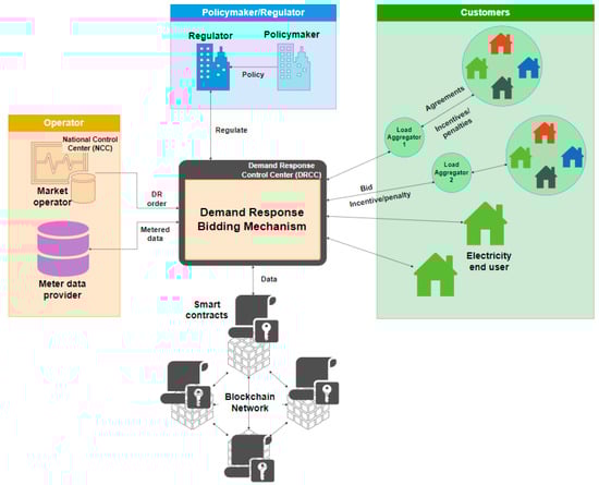 The proposed smart contracts-based demand response bidding was developed as a digital platform in the Demand Response Control Center. The business players interact with each other through this platform. A set of smart contracts executes the input data and then securely stores the data in a public blockchain. This approach enhances transparency and integrity instead of the data system owned by the individual aggregators.