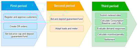 This research proposes a demand response mechanism which consists of the timeline and activities of how the demand reductions will be sold on the DR Control Center []. Figure 3 presents three periods of the proposed demand response bidding mechanism.