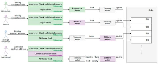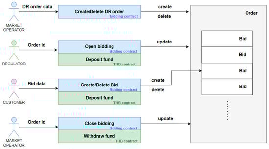 The bidding system aims to manage DR orders and bids that are data objects called the Mapping of Struct. The first object, Order, is related to the second object, Bid, using an order ID. Each Order contains multiple Bids owned by the individual bidders. Figure 4 illustrates the clear procedure to create these two objects through the following smart contracts: bidding and THB contracts. The bidding contract works as a primary contract, while the THB contract is imported to operate guaranteed funds. Firstly, after receiving the forecasting data from the National Control Center (NCC), the market operator will set the target capacity (kW) of the DR order at a particular date and time of system peak. The market operator can delete the order any time before bidding opens. Then, the regulator will set the bid price cap and deposit a guaranteed fund for DR customers’ incentives. At the same time, the order will be opened for bidding, and then the bidders create bids by calling the bidding contract. The bidders must deposit a guaranteed fund to ensure their penalty transfer if they cannot provide the demand reduction to comply with the agreement. At the end of bidding, the market operator calculates the bidding results by running the reverse auction through the bidding contract. The Order and Bids objects will be updated in the new status. The bidders who own the rejected bids will have their deposited funds returned, whereas the bidders who receive the acceptance will be granted a new role, called DR_PARTICIPANT.