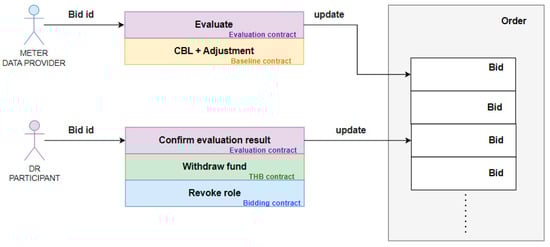 As presented in Figure 6, the key functions of the evaluation system are to evaluate the demand responses and manage the compensation according to the evaluation results. In the first step, the meter data providers submit their customers’ energy consumption data to the evaluation contract. As mentioned in Equation (1) in Section 2.3, the calculation requires the energy used and consumption baseline load, so the baseline contract with the functions of the CAISO 10in10 plus a scalar adjustment is imported to generate the consumption baseline load []. Then, the evaluation contract calculates the average performance rate and records it in the Bid object. In the second step, the DR participants confirm the evaluation results (the average performance rate) through the evaluation contract. After that, the contract will calculate the compensation using the data recorded in each bid object. Next, the THB contract is imported to transfer the incentive plus the deposited fund or the remaining deposited fund after the charge to customers. Finally, the bidding contract will revoke the DR participant role and update the new data in the Bid object.
