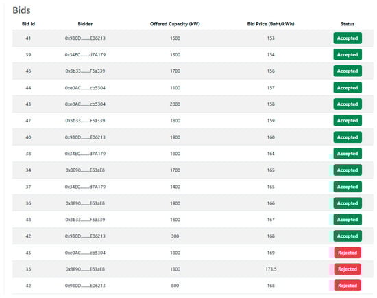 After bidding starts, each customer offers a capacity (kW) and price (Baht/kWh), estimated by the available loads and cost-benefits of load adaptation. For example, in Figure 7, the offered capacities rank between 1000 kW and 2000 kW, and the bid prices are from the net benefit and lower than the bid price cap, 150.00–173.61 Baht/kWh. The bidders will deposit the guaranteed funds to the treasury wallet for every bid. At the end of bidding, the total offered capacity shown in the result exceeds the capacity target, so some bids with lower prices are accepted. The bidders who received acceptance (green buttons) are granted to be DR participants and allowed to adapt the loads during the DR event.