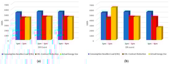 A parameter used for evaluating demand adaptation is the performance rate. This section discusses the comparison of the performance rate calculation approaches, the current approach in Thailand, and the approach proposed by this research. The performance rate calculated by the current approach is described as follows: (i) the differences between the consumption baseline load (kWh) and the actual energy used (kWh) are accumulated, and (ii) the summation value is divided by the total contract reduction (kWh) during the DR event. According to the example in Figure 8a, the performance rate calculated by the current method is (1000 + 1000 + 1000)/3000 = 1.00. In Figure 8b, the performance rate calculated by the current method is (−1000 + 1000 + 3000)/3000 = 1.00. As a result, with the performance rate of 1.00, the customer can provide an actual reduction of 3000 kWh complied with the contract. However, this approach cannot represent the stability of load adaptation. Therefore, this research proposed the average performance rate described in Section 2.3. The average performance rate calculated based on the example (a) is (1 + 1 + 1)/3 = 1.00. In example (b), the average performance rate is (0 + 1 + 1)/3 = 0.67. It is feasible to represent the performance of providing the load reduction and stability of the load adaptation.
