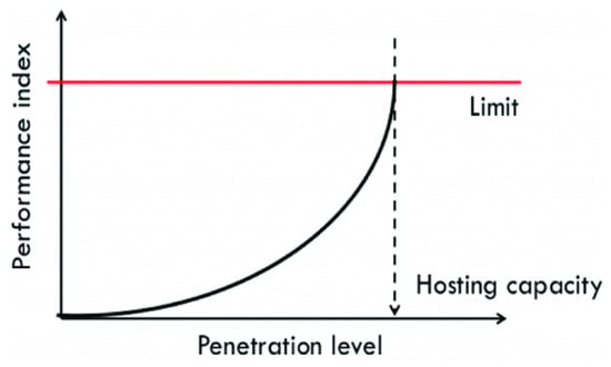 The term, “hosting capacity” has already been used in other contexts such as the capacity of web servers, watermarking of images, and settlement of refugees [,], before its adoption as a term in distributed generation (DG). Hosting capacity (HC) as a concept in DG was first introduced by André Even in March 2004 during the integrated European EU-DEEP project discussion to examine the effects of high distributed generation integration in the distribution network [,,]. This concept is illustrated in Figure 1. The theoretical application of the concept developed in [], is now the widely adopted methodology by network operators, regulators, and researchers to determine HC.
