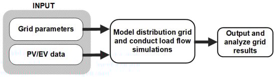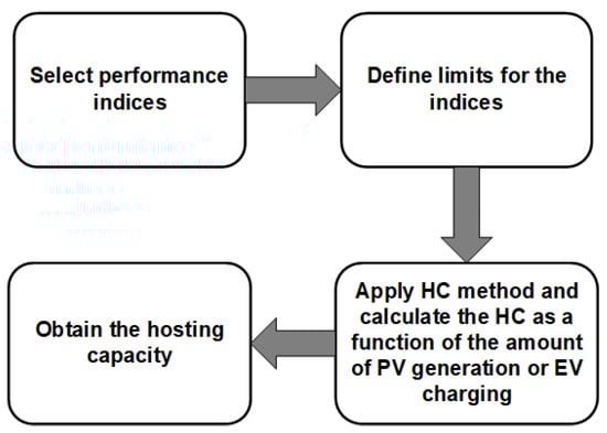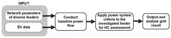 The general approach for EV charging HC calculation is shown in Figure 2 only that PV is replaced by EV and in some cases, both PV and EV are combined. There are several unknowns and uncertainties associated with EV charging such as charging patterns (the key determining factor of EV impact), phase connection (single-phase or three-phase), type of charging, location of EV on the feeder, and time and duration of charging. Moreover, connecting single-phase or three-phase EVs on the distribution network causes violations of various performance limits including thermal limits and transformer overload due to increased demand, harmonics, voltage magnitude, and voltage unbalance [,,].