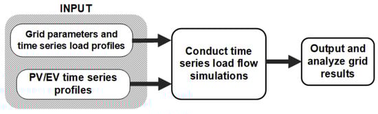 Several studies have applied the time series method shown in Figure 4 to quantify the HC of real and test LV distribution grids. In [,], the time series method is used to study the effect of solar PV integration in existing electrical distribution grids. The authors in [] looked at how high PV penetration affected an urban LV network in Sri Lanka considering network losses, active power flow, feeder voltage, secondary side power factor of transformers, and voltage unbalance as limiting factors. The results show overvoltage at the end of the feeder as the most violated performance limit. In [], different PV placement and size scenarios were developed utilizing solar PV profiles based on actual data collected from a distribution network operator, as well as residential, commercial, and industrial demand profiles. The profiles were applied to an IEEE 69 bus network to assess the impact of solar PV integration on the current and voltage profile and the distribution network’s system losses. Compared to residential and industrial load profiles, a higher reduction of losses was observed in the case of PV systems supplying commercial loads. This was mainly due to the coincidence of demand and PV generation.