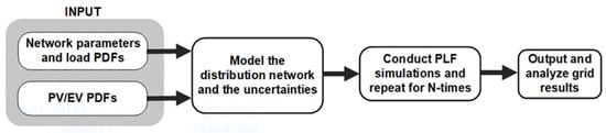 The key part of the stochastic method is the classification and modeling of uncertainties. These uncertainties can be classified into two types, aleatory and epistemic uncertainties. Aleatory uncertainties are unknown variables that occur due to variability associated with PV generation and consumers’ load consumption while epistemic uncertainties are unknown variables related to lack of information, such as the size of the PV or location of the PV on the distribution grid [,]. Several uncertainty modeling approaches exist in the literature including the probabilistic method, robust optimization, information gap decision theory, interval-based analysis, and hybrid probabilistic and possibilistic methods [,]. However, the probabilistic method is often used in the PLF with Monte Carlo Simulation (MCS) as the most common technique for generating random scenarios such as PV generation, location, size, and load profiles [,].