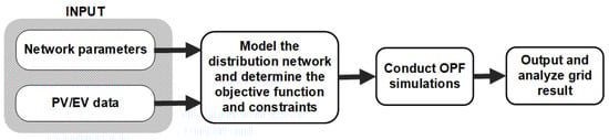 The optimization-based HC determination methods generally consider PV integration as an optimization problem. This method uses the optimal power flow technique (OPF) with the objective of maximizing the PV installed capacity while meeting the grid operational constraints. Figure 6 shows the general process of the optimization method. The most common techniques used to solve this optimization problem are Particle Swarm Optimization [], Artificial Bee Colony [], Robust optimization [,], and Genetic Algorithm [,]. Some studies using the optimization method can define a single objective function to maximize the HC [,], while other studies can set up multiple objective functions to determine the HC that results in maximizing PV installations and minimizing the network losses or cost [,].