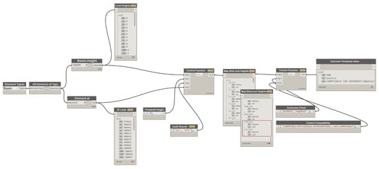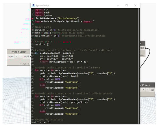 Finally, a Python script was developed in Revit to create a custom node in Dynamo that automates the distance check between geospatial services, producing a positive or negative result based on the proximity analysis (Figure 8).