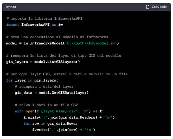The script uses the ‘InfraworksModel’ function to connect to the InfraWorks model, the ‘ListGISLayers’ function to retrieve the list of GIS layers in the model, and the ‘GetGISData’ function to extract the data from each layer and save it in a CSV file.