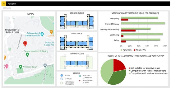 Figure 9 shows an example of a dashboard generated with Power BI that allows you to visualize the audit results carried out with the proposed tool and easily compare different buildings to plan adaptive reuse interventions more efficiently.