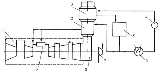 The scheme of the “Aquarius” type power plant: 1—gas turbine engine; 2—waste heat boiler; 3—steam-gas condenser; 4—electric pump; 5—condensate collector; 6—cooler; 7—power consumer; 8—gas outlet; 9—gas turbine combustion chamber.
