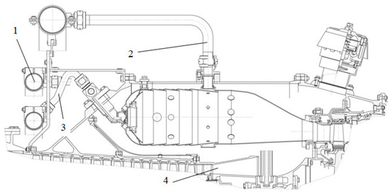 The combustion chamber of the “Aquarius” gas–steam power plant with a capacity of 16 MW is a diffusion chamber of a tubular-annular type. A characteristic feature of the combustion chamber is the injection of steam into different parts of the chamber, namely the combustion zone and the dilution zone. This increases the power of the plant and reduces concentrations of nitrogen oxides. An innovative design solution in Figure 3 is the dispersed steam supply along the length of the combustion chamber, as well as the ratio of steam flow rates supplied to these zones to reduce nitrogen oxide emissions.
